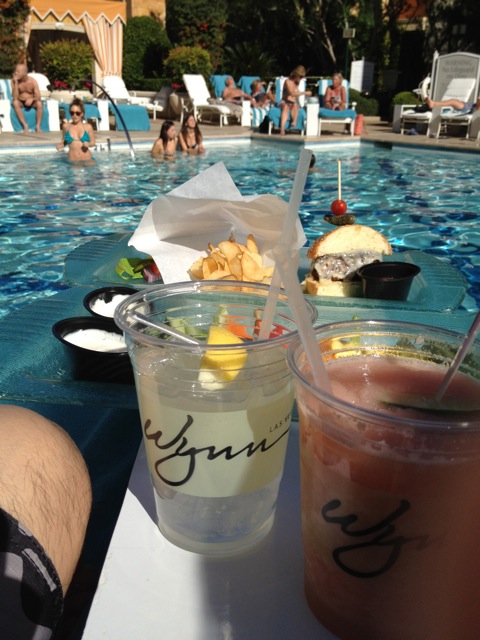 Enjoying a burger, vegetable crudites, and a guava margarita by the pool