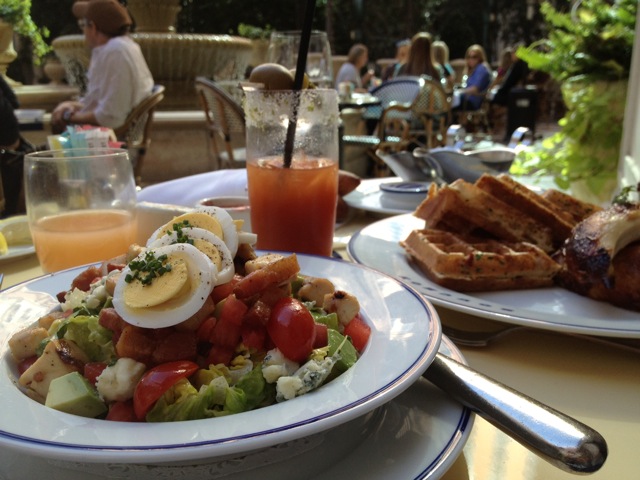 Brunch at Bouchon! Cobb salad, chicken & waffles (Yum!), and a bloody mary. A great way to start the morning!