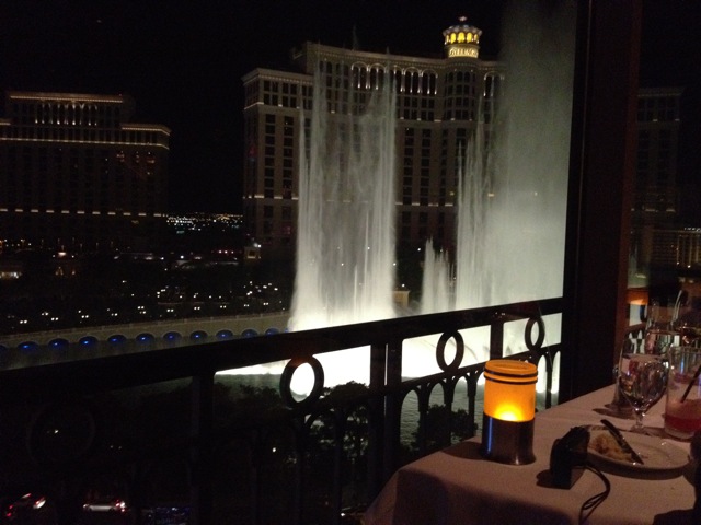Our window-side table at the Eiffel Tower restaurant overlooking the Bellagio fountains