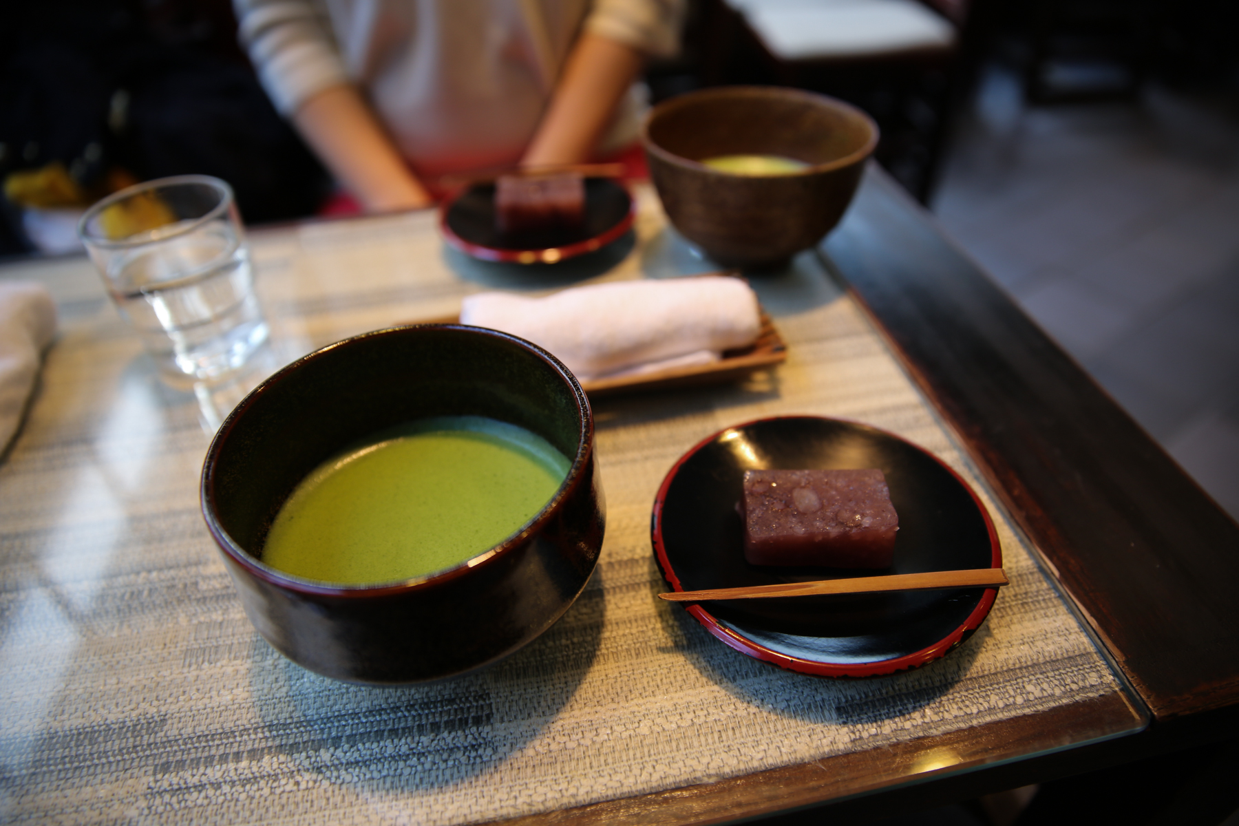 Taking a quick tea break in the Gion district. We sat down to a cup of traditional matcha green tea and a sweet bean dessert.