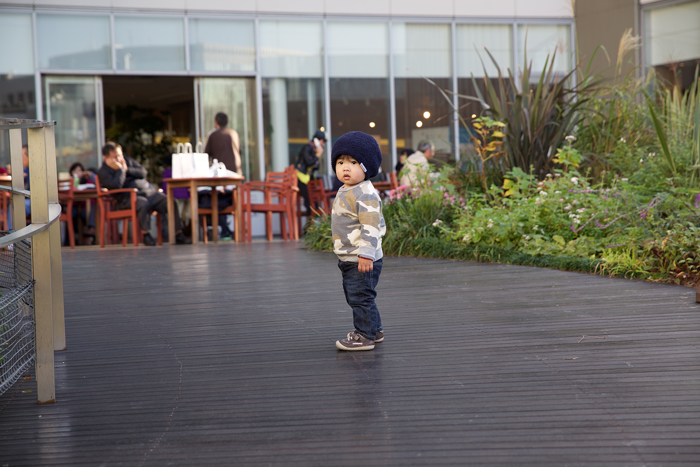 Running around outside on the rooftop terrace. The terrace gardens were very well-kept and stroller friendly!