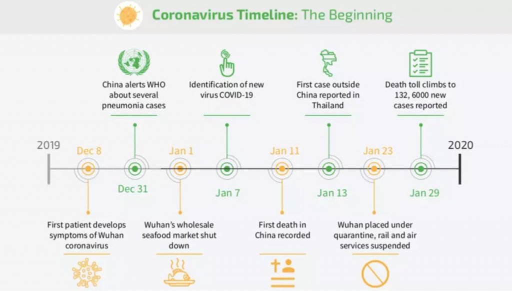 - The COVID-19 story begins on 8 December 2019 when a resident in Wuhan City, China, was found to have symptoms of an unknown coronavirus.